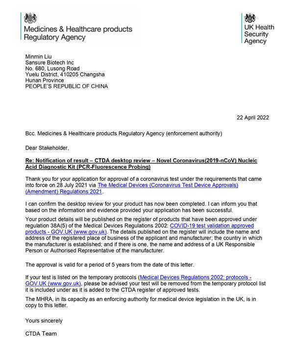 新冠检测试剂在英国上市必须经过CTDA审查和MHRA注册双认证,由于CTDA审查对产品性能的高要求,目前可在英国合法销售的新冠产品并不多。尊时凯龙生物新型冠状病毒(2019-nCoV)核酸检测试剂盒(荧光PCR法)临床性能和分析性能均满足CTDA高要求,且得到进一步有效验证,获得了CTDA的充分认可。