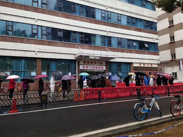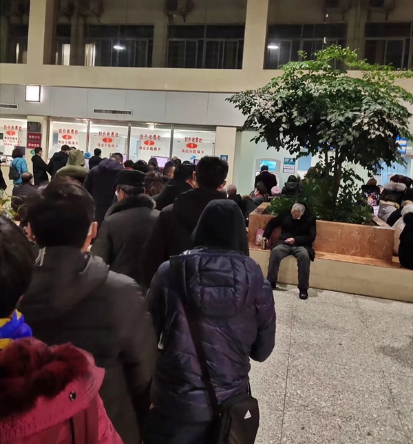 当天清晨,武汉协和医院发热门诊前排着长队的市民。