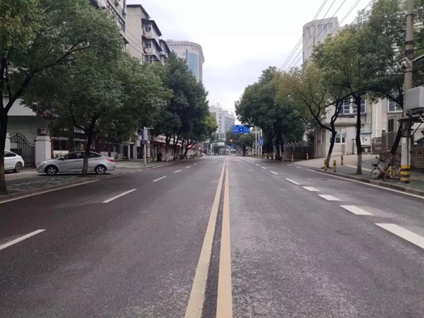 今日凌晨,武汉所有住宅小区实行封闭管理之后,街上不见行人。